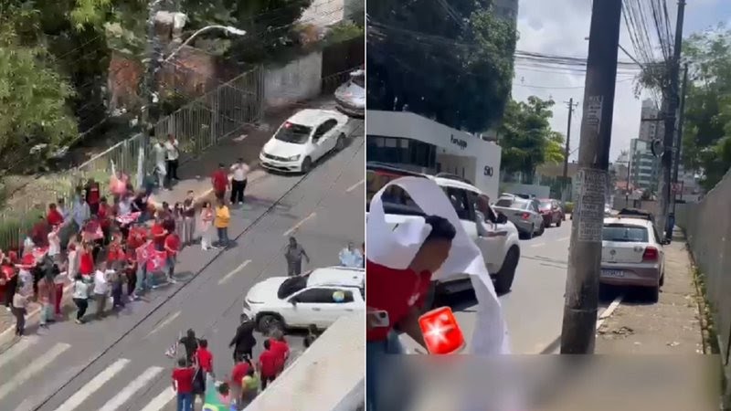 Apoiadores do candidato a prefeito de Camaçari, Luiz Caetano (PT), provocaram em coro o adversário dele, Flávio Matos (União Brasil), na porta da emissora chamando-o de “playboy” e “garoto da Shopee” – entre outros adjetivos.