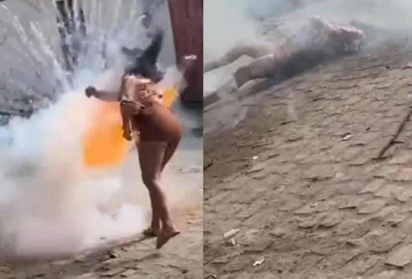 A vítima acendeu o artefato e tentou arremessá-lo, mas a espada retornou e explodiu próximo ao seu rosto. O momento foi registrado em vídeo, mostrando a mulher caindo no chão após a explosão.